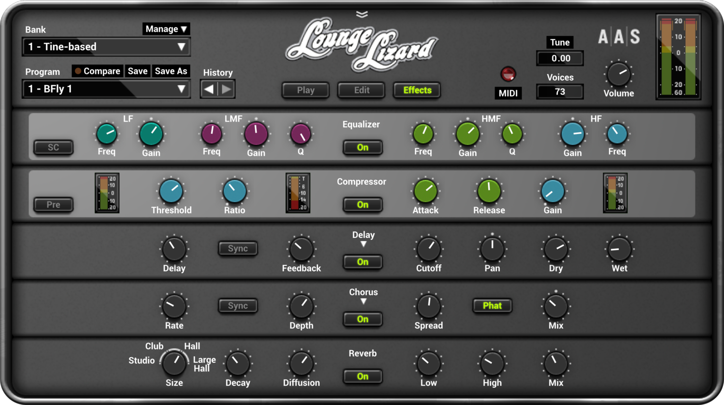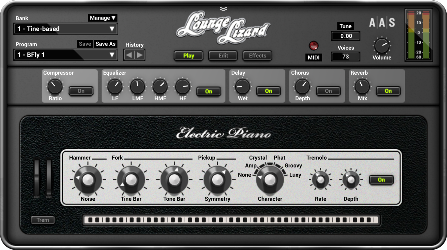 - The high-end effects section has been extended with tremolo, wah, chorus, phaser, delay, reverb, and EQ making Lounge Lizard a complete and self-contained electric piano solution